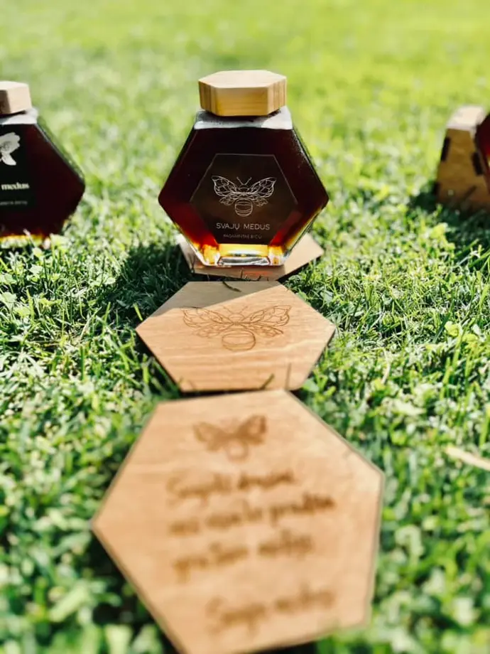 Laimingų bičių medus unikalioje, tausojančioje korio formos pakuotėje.